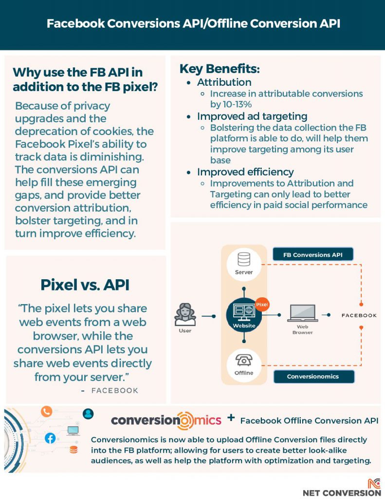 Facebook Conversions API allows FB to collect additional data, which when partnered with the FB Pixel can help the platform optimize.